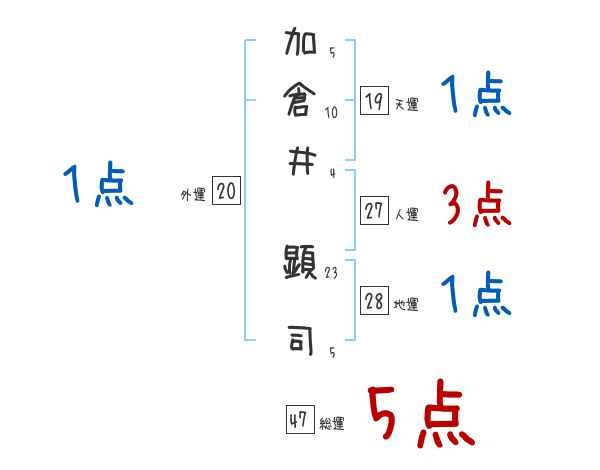 総運![]() | 加倉井顕司さんの総運は47画の5つ星!実力が開花し発展する円満な人生。財に恵まれる。 あなたの人生を表す1番重要な運勢です。生涯を通じて影響する総合運となり、主に50歳以降の晩年期に影響を及ぼします。 |