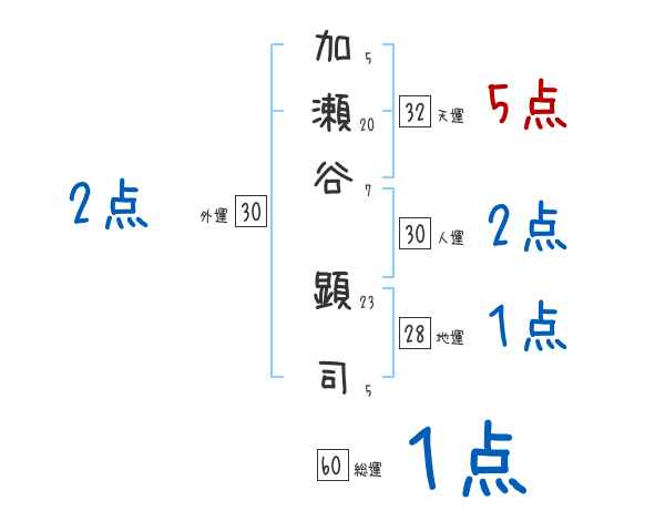 天運![]() | 加瀬谷顕司さんの天運は32画の5つ星!柔軟性があり成功する。チャンスが多く金運が良い。 家系が持つ宿命的な運勢を表します。祖先から受け継いだ苗字ですので自分の力が及びません。家柄を象徴します。 |