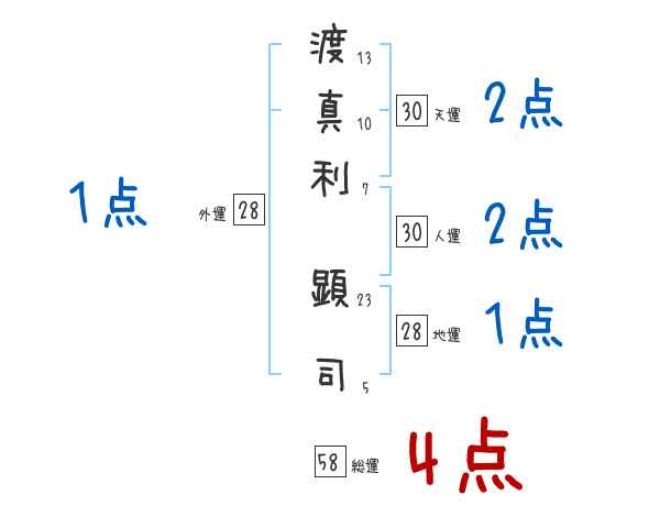 天運![]() | 渡真利顕司さんの天運は30画の2つ星!浮き沈みの激しさに注意しましょう。 家系が持つ宿命的な運勢を表します。祖先から受け継いだ苗字ですので自分の力が及びません。家柄を象徴します。 |