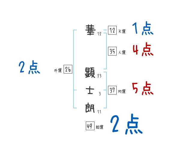 天運![]() | 華顕士朗さんの天運は12画の1つ星!簡単な失敗で諦めてしまいやすいかも。着実に行動すると良いでしょう。 家系が持つ宿命的な運勢を表します。祖先から受け継いだ苗字ですので自分の力が及びません。家柄を象徴します。 |