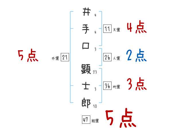 総運![]() | 井手口顕士郎さんの総運は47画の5つ星!実力が開花し発展する円満な人生。財に恵まれる。 あなたの人生を表す1番重要な運勢です。生涯を通じて影響する総合運となり、主に50歳以降の晩年期に影響を及ぼします。 |
