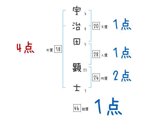 総運![]() | 宇治田顕士さんの総運は46画の1つ星!迷走することが多く苦労するかも。目先のことにとらわれないように。 あなたの人生を表す1番重要な運勢です。生涯を通じて影響する総合運となり、主に50歳以降の晩年期に影響を及ぼします。 |