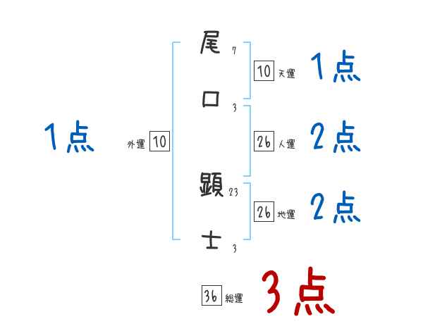 総運![]() | 尾口顕士さんの総運は36画の3つ星!先見性が豊かです。多少神経質で苦労することも。 あなたの人生を表す1番重要な運勢です。生涯を通じて影響する総合運となり、主に50歳以降の晩年期に影響を及ぼします。 |