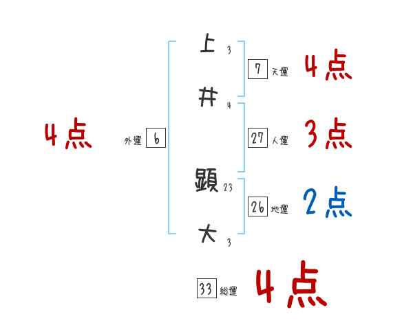 総運![]() | 上井顕大さんの総運は33画の4つ星!権力志向でプライドが高い。勇気があり運を切り開き成功する。 あなたの人生を表す1番重要な運勢です。生涯を通じて影響する総合運となり、主に50歳以降の晩年期に影響を及ぼします。 |