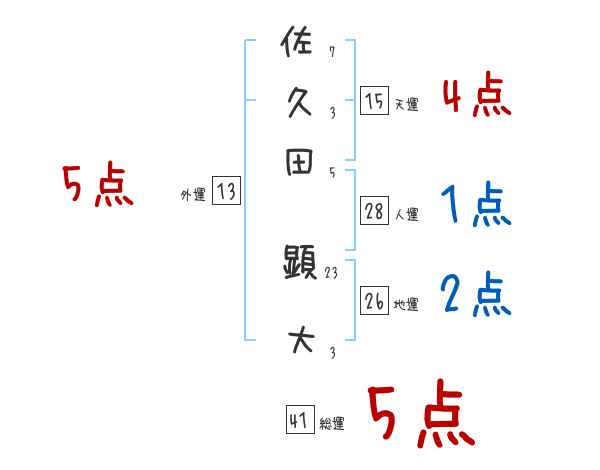 人運![]() | 佐久田顕大さんの人運は28画の1つ星!家庭環境に注意。スポーツで活躍できる能力があるかも。 性格や才能などを表す2番目に重要な運勢です。人間関係や協調性、社会的な成功に影響します。主に20歳から50歳ぐらいまでの中年期の運勢を表します。 |