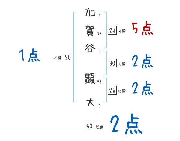 天運![]() | 加賀谷顕大さんの天運は24画の5つ星!家庭運が良く順調な人生。金運にも恵まれる。 家系が持つ宿命的な運勢を表します。祖先から受け継いだ苗字ですので自分の力が及びません。家柄を象徴します。 |
