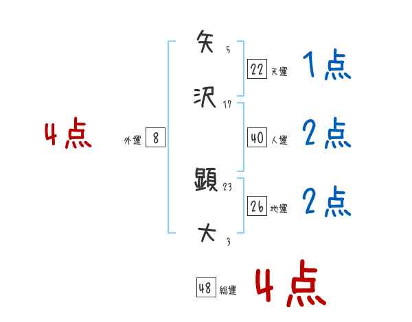 天運![]() | 矢沢顕大さんの天運は22画の1つ星!努力することが苦手ないっぽう手先が器用。芸術性にも優れる。 家系が持つ宿命的な運勢を表します。祖先から受け継いだ苗字ですので自分の力が及びません。家柄を象徴します。 |
