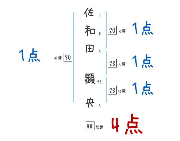 人運![]() | 佐和田顕央さんの人運は28画の1つ星!家庭環境に注意。スポーツで活躍できる能力があるかも。 性格や才能などを表す2番目に重要な運勢です。人間関係や協調性、社会的な成功に影響します。主に20歳から50歳ぐらいまでの中年期の運勢を表します。 |