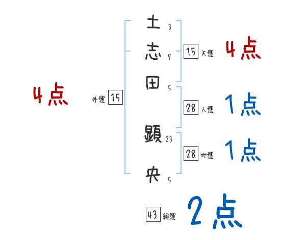 人運![]() | 土志田顕央さんの人運は28画の1つ星!家庭環境に注意。スポーツで活躍できる能力があるかも。 性格や才能などを表す2番目に重要な運勢です。人間関係や協調性、社会的な成功に影響します。主に20歳から50歳ぐらいまでの中年期の運勢を表します。 |