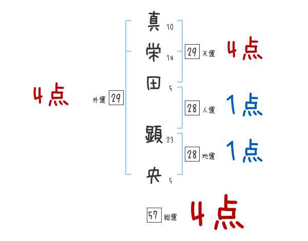 外運![]() | 真栄田顕央さんの外運は29画の4つ星!完全主義で才能がある。厳格な心の持ち主。 生活面を象徴する運勢です。外部から受ける影響力を表し、結婚運、家庭運や職場、環境への順応性を表します。 |
