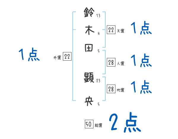天運![]() | 鈴木田顕央さんの天運は22画の1つ星!努力することが苦手ないっぽう手先が器用。芸術性にも優れる。 家系が持つ宿命的な運勢を表します。祖先から受け継いだ苗字ですので自分の力が及びません。家柄を象徴します。 |