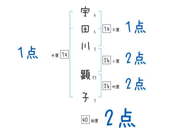 天運![]() | 宇田川顕子さんの天運は14画の1つ星!人に対して優しいがストレスを溜め込みがち。人間関係のトラブルを避けるよう気をつけましょう。 家系が持つ宿命的な運勢を表します。祖先から受け継いだ苗字ですので自分の力が及びません。家柄を象徴します。 |