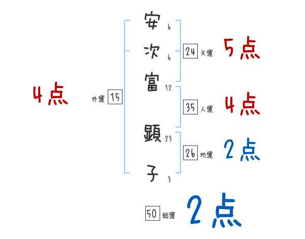 人運![]() | 安次富顕子さんの人運は35画の4つ星!温厚な性格で感受性が高い。穏和な性格で人望が厚い。 性格や才能などを表す2番目に重要な運勢です。人間関係や協調性、社会的な成功に影響します。主に20歳から50歳ぐらいまでの中年期の運勢を表します。 |