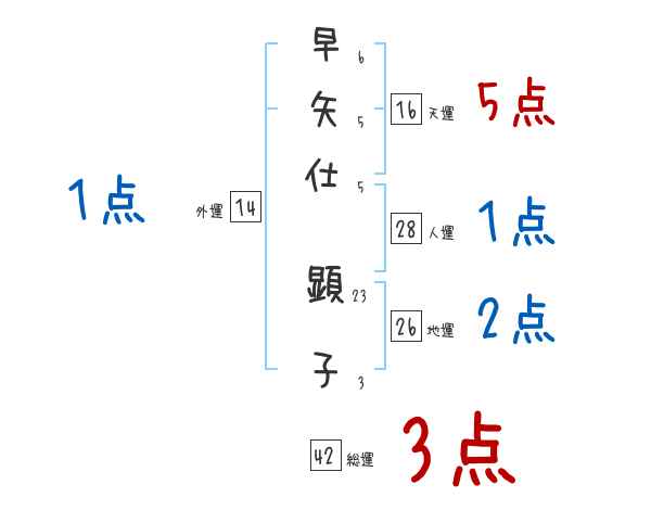 地運![]() | 早矢仕顕子さんの地運は26画の2つ星!波瀾万丈かも。信頼できる人を大事にしましょう。 個性を表す基礎的な運勢です。性格形成や対人関係、行動力など家庭環境に影響されます。主に誕生してから20歳くらいまでの若年期の運勢を表します。 |