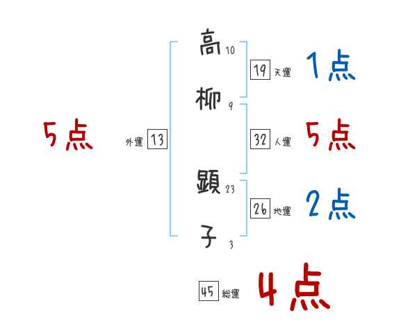 人運![]() | 高柳顕子さんの人運は32画の5つ星!柔軟性があり成功する。チャンスが多く金運が良い。 性格や才能などを表す2番目に重要な運勢です。人間関係や協調性、社会的な成功に影響します。主に20歳から50歳ぐらいまでの中年期の運勢を表します。 |