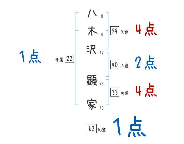 外運![]() | 八木沢顕家さんの外運は22画の1つ星!努力することが苦手ないっぽう手先が器用。芸術性にも優れる。 生活面を象徴する運勢です。外部から受ける影響力を表し、結婚運、家庭運や職場、環境への順応性を表します。 |