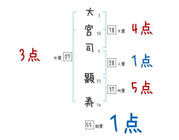 天運![]() | 大宮司顕寿さんの天運は18画の4つ星!情熱的で剛気。忍耐力があり信頼される。 家系が持つ宿命的な運勢を表します。祖先から受け継いだ苗字ですので自分の力が及びません。家柄を象徴します。 |