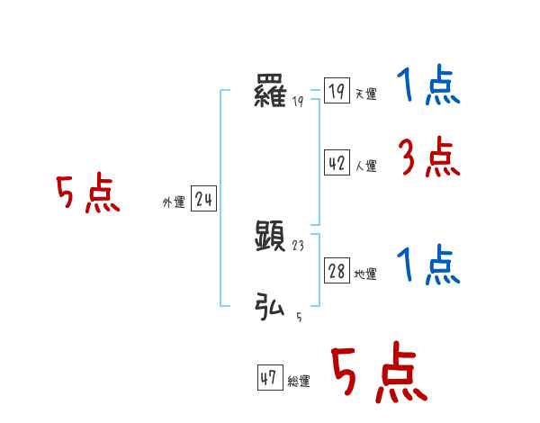 外運![]() | 羅顕弘さんの外運は24画の5つ星!家庭運が良く順調な人生。金運にも恵まれる。 生活面を象徴する運勢です。外部から受ける影響力を表し、結婚運、家庭運や職場、環境への順応性を表します。 |