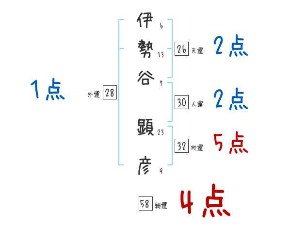 天運![]() | 伊勢谷顕彦さんの天運は26画の2つ星!波瀾万丈かも。信頼できる人を大事にしましょう。 家系が持つ宿命的な運勢を表します。祖先から受け継いだ苗字ですので自分の力が及びません。家柄を象徴します。 |