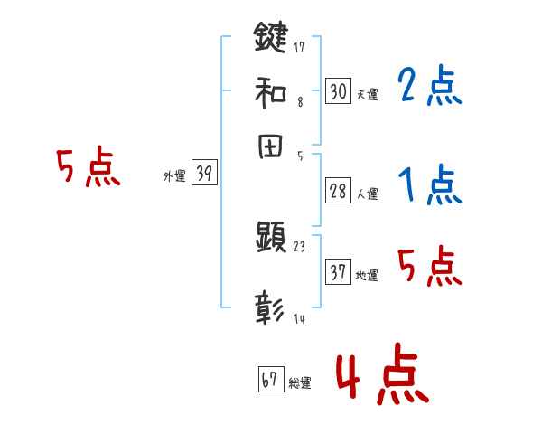 外運![]() | 鍵和田顕彰さんの外運は39画の5つ星!社交性に優れ人望が厚い。人の上に立ち成功する。 生活面を象徴する運勢です。外部から受ける影響力を表し、結婚運、家庭運や職場、環境への順応性を表します。 |