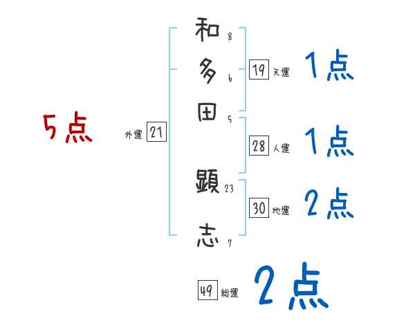 天運![]() | 和多田顕志さんの天運は19画の1つ星!優れた才能を持ちますが、協調性が足りないことも。周りの人と協力する事を意識しましょう。 家系が持つ宿命的な運勢を表します。祖先から受け継いだ苗字ですので自分の力が及びません。家柄を象徴します。 |