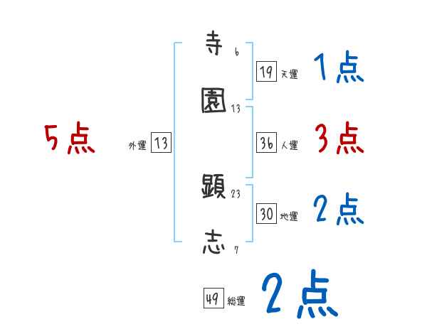 外運![]() | 寺園顕志さんの外運は13画の5つ星!才能に恵まれ人気がある。名声を手に入れる。円満な人生。 生活面を象徴する運勢です。外部から受ける影響力を表し、結婚運、家庭運や職場、環境への順応性を表します。 |