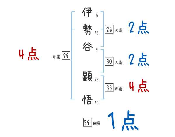 天運![]() | 伊勢谷顕悟さんの天運は26画の2つ星!波瀾万丈かも。信頼できる人を大事にしましょう。 家系が持つ宿命的な運勢を表します。祖先から受け継いだ苗字ですので自分の力が及びません。家柄を象徴します。 |
