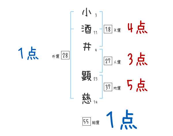 総運![]() | 小酒井顕慈さんの総運は55画の1つ星!欲張りな性格で軽率な行動に注意しましょう。病気に気をつけて。 あなたの人生を表す1番重要な運勢です。生涯を通じて影響する総合運となり、主に50歳以降の晩年期に影響を及ぼします。 |