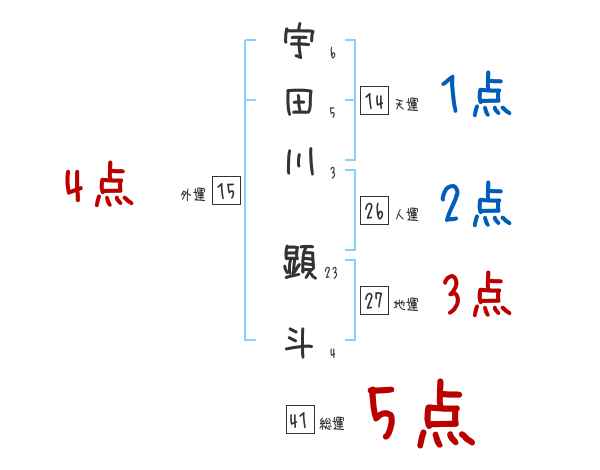 総運![]() | 宇田川顕斗さんの総運は41画の5つ星!大志を抱き、目標に向かって実力を発揮し達成する。温和な性格。 あなたの人生を表す1番重要な運勢です。生涯を通じて影響する総合運となり、主に50歳以降の晩年期に影響を及ぼします。 |