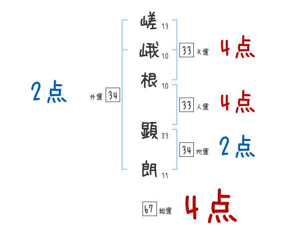 天運![]() | 嵯峨根顕朗さんの天運は33画の4つ星!権力志向でプライドが高い。勇気があり運を切り開き成功する。 家系が持つ宿命的な運勢を表します。祖先から受け継いだ苗字ですので自分の力が及びません。家柄を象徴します。 |