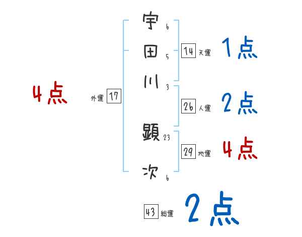 外運![]() | 宇田川顕次さんの外運は17画の4つ星!積極的な行動力。地位を気づき財産を手に入れる。純粋な心と直感力。 生活面を象徴する運勢です。外部から受ける影響力を表し、結婚運、家庭運や職場、環境への順応性を表します。 |