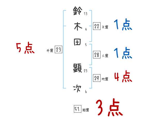外運![]() | 鈴木田顕次さんの外運は23画の5つ星!想像力に優れ活力がある。一代で成功し名誉を手に入れる。 生活面を象徴する運勢です。外部から受ける影響力を表し、結婚運、家庭運や職場、環境への順応性を表します。 |