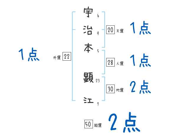 総運![]() | 宇治本顕江さんの総運は50画の2つ星!浮き沈みが激しく不安定。しりすぼみに衰退しやすいので注意しましょう。 あなたの人生を表す1番重要な運勢です。生涯を通じて影響する総合運となり、主に50歳以降の晩年期に影響を及ぼします。 |