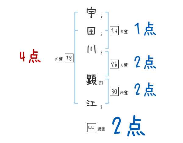 総運![]() | 宇田川顕江さんの総運は44画の2つ星!誠実で慎重な性格。物事を考えすぎないように注意しましょう。 あなたの人生を表す1番重要な運勢です。生涯を通じて影響する総合運となり、主に50歳以降の晩年期に影響を及ぼします。 |