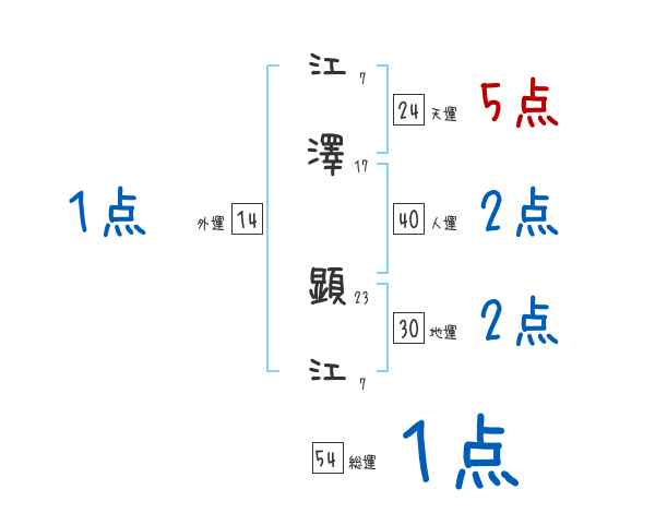 天運![]() | 江澤顕江さんの天運は24画の5つ星!家庭運が良く順調な人生。金運にも恵まれる。 家系が持つ宿命的な運勢を表します。祖先から受け継いだ苗字ですので自分の力が及びません。家柄を象徴します。 |