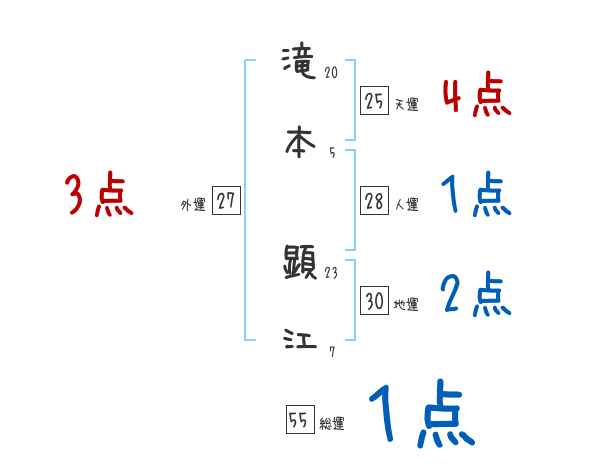 天運![]() | 滝本顕江さんの天運は25画の4つ星!個性があり才能があふれる。強運の持ち主で発展する。 家系が持つ宿命的な運勢を表します。祖先から受け継いだ苗字ですので自分の力が及びません。家柄を象徴します。 |