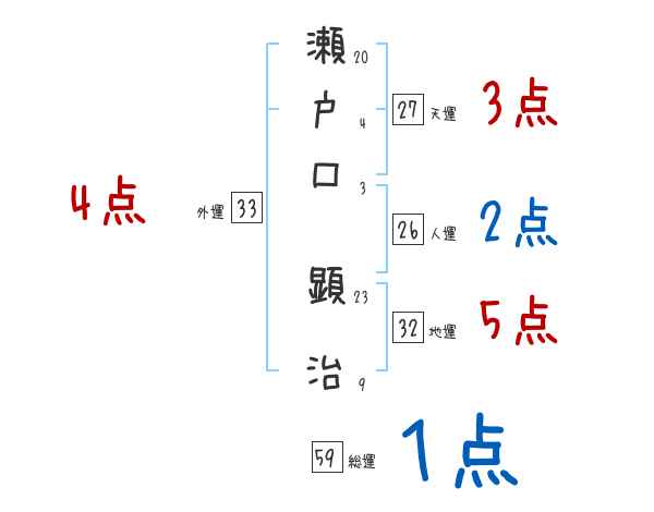 外運![]() | 瀬戸口顕治さんの外運は33画の4つ星!権力志向でプライドが高い。勇気があり運を切り開き成功する。 生活面を象徴する運勢です。外部から受ける影響力を表し、結婚運、家庭運や職場、環境への順応性を表します。 |