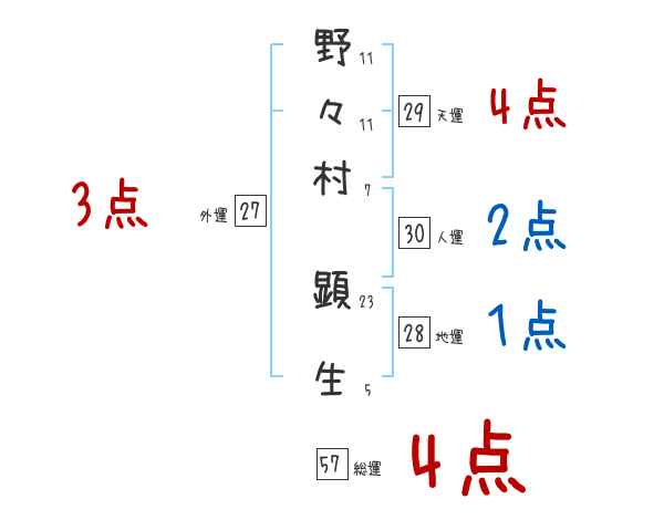 天運![]() | 野々村顕生さんの天運は29画の4つ星!完全主義で才能がある。厳格な心の持ち主。 家系が持つ宿命的な運勢を表します。祖先から受け継いだ苗字ですので自分の力が及びません。家柄を象徴します。 |