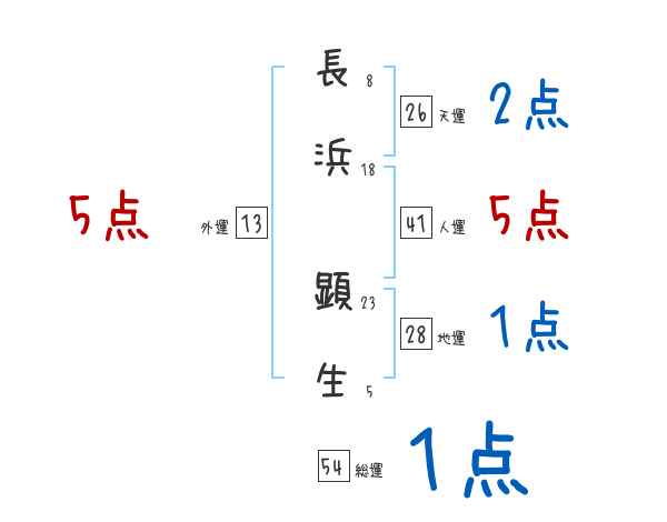 | 天運  | 長浜顕生さんの天運は26画の2つ星!波瀾万丈かも。信頼できる人を大事にしましょう。家系が持つ宿命的な運勢を表します。祖先から受け継いだ苗字ですので自分の力が及びません。家柄を象徴します。 |