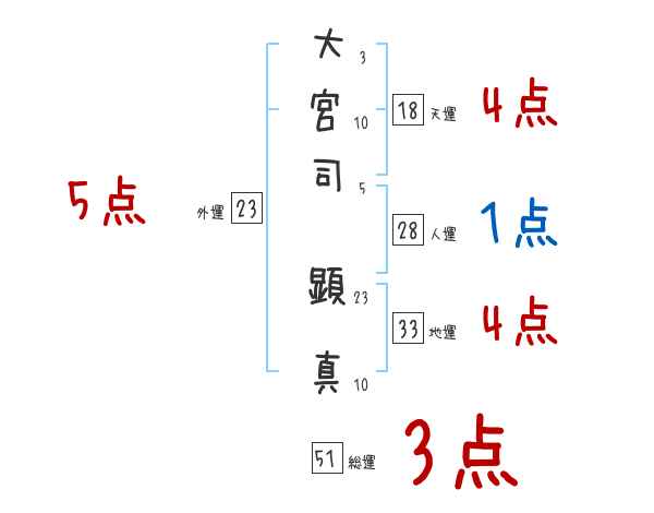 外運![]() | 大宮司顕真さんの外運は23画の5つ星!想像力に優れ活力がある。一代で成功し名誉を手に入れる。 生活面を象徴する運勢です。外部から受ける影響力を表し、結婚運、家庭運や職場、環境への順応性を表します。 |