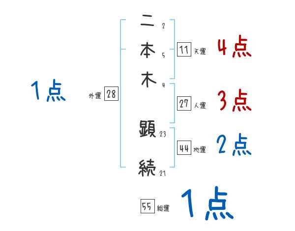 地運![]() | 二本木顕続さんの地運は44画の2つ星!誠実で慎重な性格。物事を考えすぎないように注意しましょう。 個性を表す基礎的な運勢です。性格形成や対人関係、行動力など家庭環境に影響されます。主に誕生してから20歳くらいまでの若年期の運勢を表します。 |