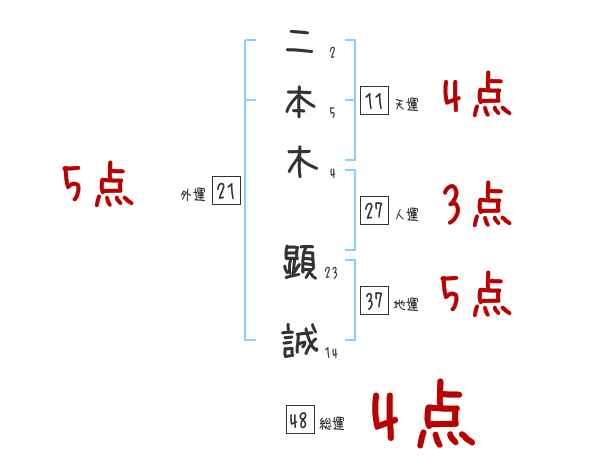 天運![]() | 二本木顕誠さんの天運は11画の4つ星!着実に富や地位を得る幸運な人生。 家系が持つ宿命的な運勢を表します。祖先から受け継いだ苗字ですので自分の力が及びません。家柄を象徴します。 |