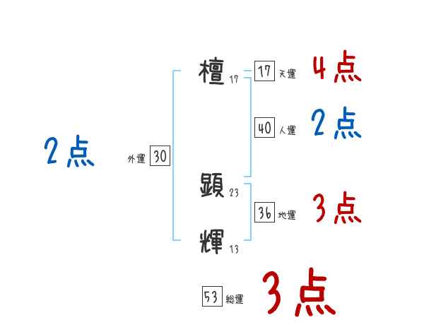 外運![]() | 檀顕輝さんの外運は30画の2つ星!浮き沈みの激しさに注意しましょう。 生活面を象徴する運勢です。外部から受ける影響力を表し、結婚運、家庭運や職場、環境への順応性を表します。 |