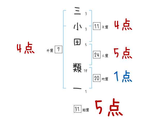 天運![]() | 三小田類一さんの天運は11画の4つ星!着実に富や地位を得る幸運な人生。 家系が持つ宿命的な運勢を表します。祖先から受け継いだ苗字ですので自分の力が及びません。家柄を象徴します。 |