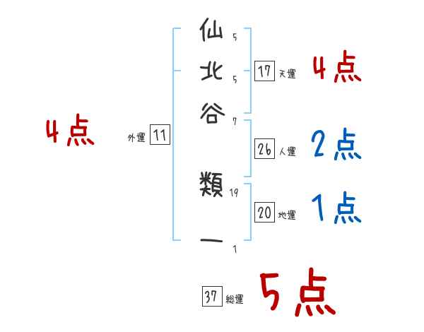 天運![]() | 仙北谷類一さんの天運は17画の4つ星!積極的な行動力。地位を気づき財産を手に入れる。純粋な心と直感力。 家系が持つ宿命的な運勢を表します。祖先から受け継いだ苗字ですので自分の力が及びません。家柄を象徴します。 |