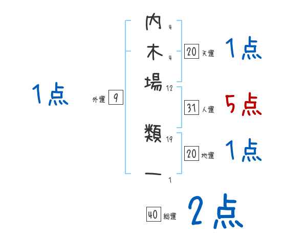 人運![]() | 内木場類一さんの人運は31画の5つ星!社交性があり判断力に優れる。順風満帆な人生で円満な生活。 性格や才能などを表す2番目に重要な運勢です。人間関係や協調性、社会的な成功に影響します。主に20歳から50歳ぐらいまでの中年期の運勢を表します。 |