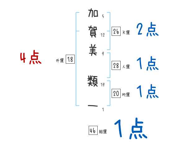 総運![]() | 加賀美類一さんの総運は46画の1つ星!迷走することが多く苦労するかも。目先のことにとらわれないように。 あなたの人生を表す1番重要な運勢です。生涯を通じて影響する総合運となり、主に50歳以降の晩年期に影響を及ぼします。 |