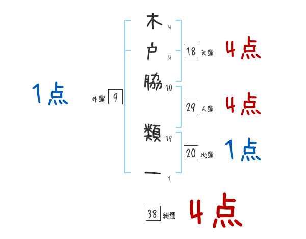 天運![]() | 木戸脇類一さんの天運は18画の4つ星!情熱的で剛気。忍耐力があり信頼される。 家系が持つ宿命的な運勢を表します。祖先から受け継いだ苗字ですので自分の力が及びません。家柄を象徴します。 |