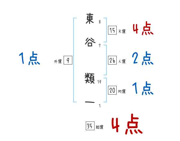 総運![]() | 東谷類一さんの総運は35画の4つ星!温厚な性格で感受性が高い。穏和な性格で人望が厚い。 あなたの人生を表す1番重要な運勢です。生涯を通じて影響する総合運となり、主に50歳以降の晩年期に影響を及ぼします。 |