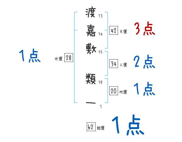 総運![]() | 渡嘉敷類一さんの総運は62画の1つ星!困難なトラブルが多く精神的に疲労しないように気をつけましょう。 あなたの人生を表す1番重要な運勢です。生涯を通じて影響する総合運となり、主に50歳以降の晩年期に影響を及ぼします。 |